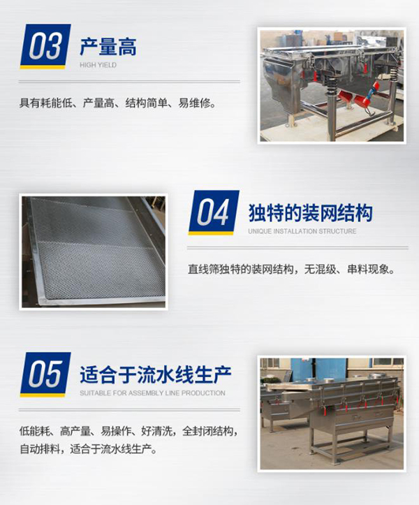 不銹鋼直線振動篩根據(jù)用戶現(xiàn)場要求可座式或吊式安裝,篩面有金屬編織網(wǎng)、鑄造、焊接、沖孔等多種形式,可滿足不同篩分作業(yè)要求。
